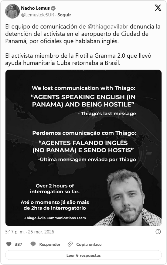 El equipo de comunicación de Thiago Ávila denunció este miércoles 25 de marzo la detención del activista brasileño en el Aeropuerto Internacional de Tocumen, en Panamá. Según se conoció, el integrante del buque Granma 2.0, perteneciente al convoy Nuestra América, fue interceptado por agentes que hablaban inglés mientras realizaba una escala en su viaje de retorno hacia Brasil.