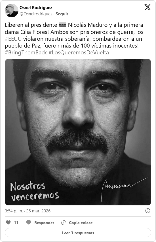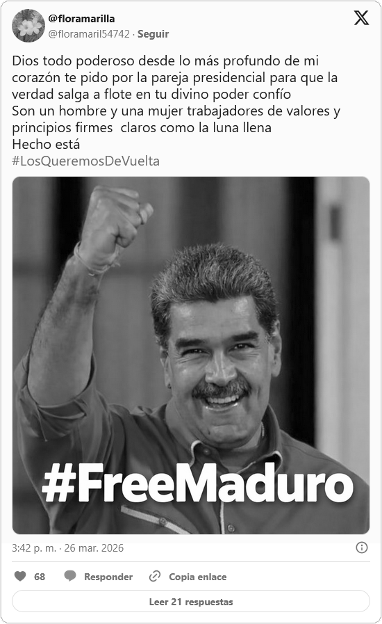 El pueblo de venezolano, junto a movimientos sociales y comunales, se concentra este jueves 26 de marzo en la Plaza Bolívar de Caracas, ubicada en el centro de la ciudad capital, para expresar su apoyo al presidente constitucional de Venezuela, Nicolás Maduro y la primera dama Cilia Flores, quienes permanecen retenidos de manera ilegal en Estados Unidos desde el 3 de enero de 2026.