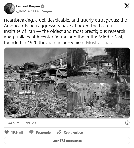 Baghaei denunció que el bombardeo no es un incidente aislado, sino una violación flagrante de los principios humanitarios al dirigirse contra uno de los centros científicos más prestigiosos de la región.
