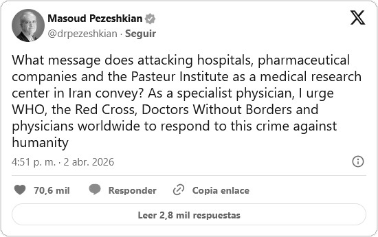 El presidente de Irán, Masoud Pezeshkian, lanzó un urgente llamado a las organizaciones internacionales y a la comunidad médica global tras el bombardeo perpetrado por las fuerzas de Estados Unidos e Israel contra el Instituto Pasteur en Teherán.