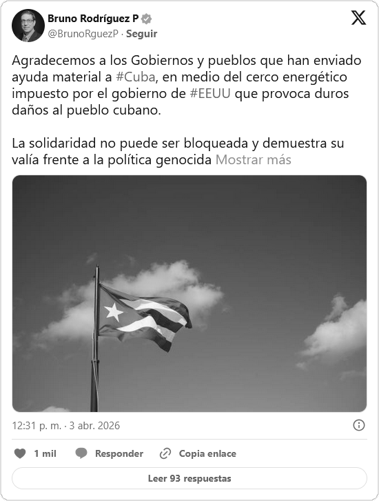 Ante la reciente arremetida del presidente de Estados Unidos, Donald Trump, contra Cuba, la solidaridad internacional se ha manifestado de diversas maneras, con ayuda solidarias, manifestaciones y pronunciamientos. En esta misma línea, este viernes, 3 de abril, el canciller de la isla, Bruno Rodríguez, agradeció a los Gobiernos y pueblos que han enviado asistencia material a su país.