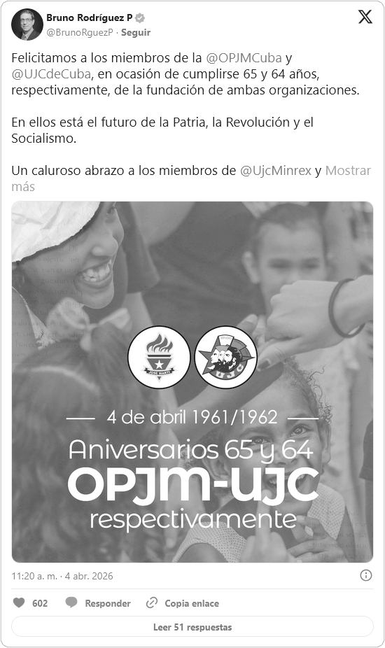 El canciller cubano Bruno Rodríguez también se sumó al reconocimiento, resaltando el liderazgo de los jóvenes diplomáticos en las tareas de la política exterior. Rodríguez subrayó que en la militancia juvenil reside la garantía de la Revolución y el Socialismo, enviando un abrazo especial a quienes cumplen tareas de activismo desde el servicio exterior.