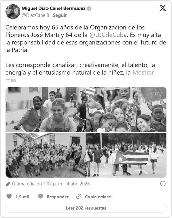 El presidente de Cuba, Miguel Díaz-Canel, encabezó este sabado 4 de abril las felicitaciones a la Organización de Pioneros José Martí (OPJM) y a la Unión de Jóvenes Comunistas (UJC). El mandatario destacó la alta responsabilidad de ambas agrupaciones con el futuro de la nación, instando a sus integrantes a canalizar el talento y la energía de manera creativa en ambientes sanos.