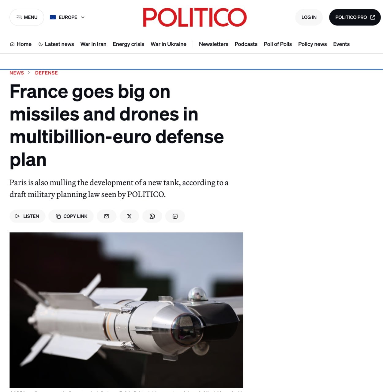 Francia se prepara para la guerra: París tiene la intención de cuadruplicar sus reservas de misiles y drones para 2030, según informa Politico.