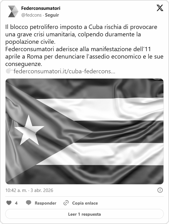 La Federación Nacional de Consumidores y Usuarios de Italia (Federconsumatori) confirmó su participación en la manifestación que tendrá lugar en Roma el próximo sábado 11 de abril. Bajo la consigna de que «Cuba no representa una amenaza«, la organización se sumará a una amplia coalición de movimientos sociales para denunciar el impacto del bloqueo estadounidense sobre la población cubana.