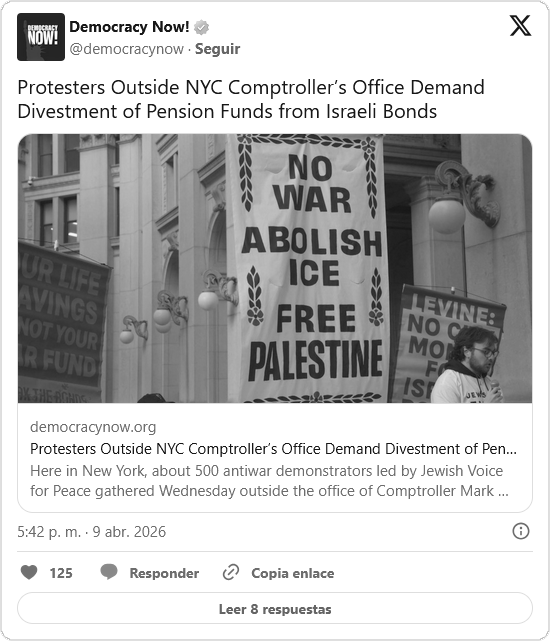 Unos 500 manifestantes, liderados por la organización «Voz Judía por la Paz», se concentraron este miércoles frente a la oficina del contralor de Nueva York, Mark Levine. La movilización rechazó los planes de invertir fondos de pensiones de la ciudad en bonos israelíes, instrumentos financieros que proveen recursos para las agresiones militares en Palestina, Líbano e Irán.