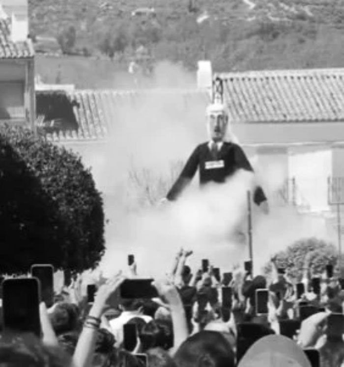 Autoridades del pueblo El Burgo, una localidad de menos de 2.000 habitantes en Málaga, celebró la tradicional Quema de Judas el Domingo de Resurrección, esta vez con un mensaje simbólico de «No a la guerra, al genocidio», según explicó a la prensa la alcaldesa María Dolores Narváez. Los pobladores quemaron un muñeco de siete metros lleno con unos 14 kilos de pólvora que representaba a Netanyahu.