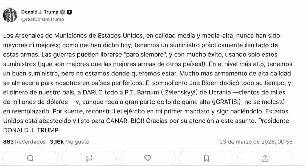 Las advertencias técnicas del Pentágono contrastan con las recientes declaraciones del presidente Donald Trump. A través de su red social Truth Social, el mandatario afirmó semanas atrás que su nación tiene «garantizados» los suministros para afrontar las consecuencias de su política bélica, asegurando que las guerras podrían librarse «eternamente» y con éxito.