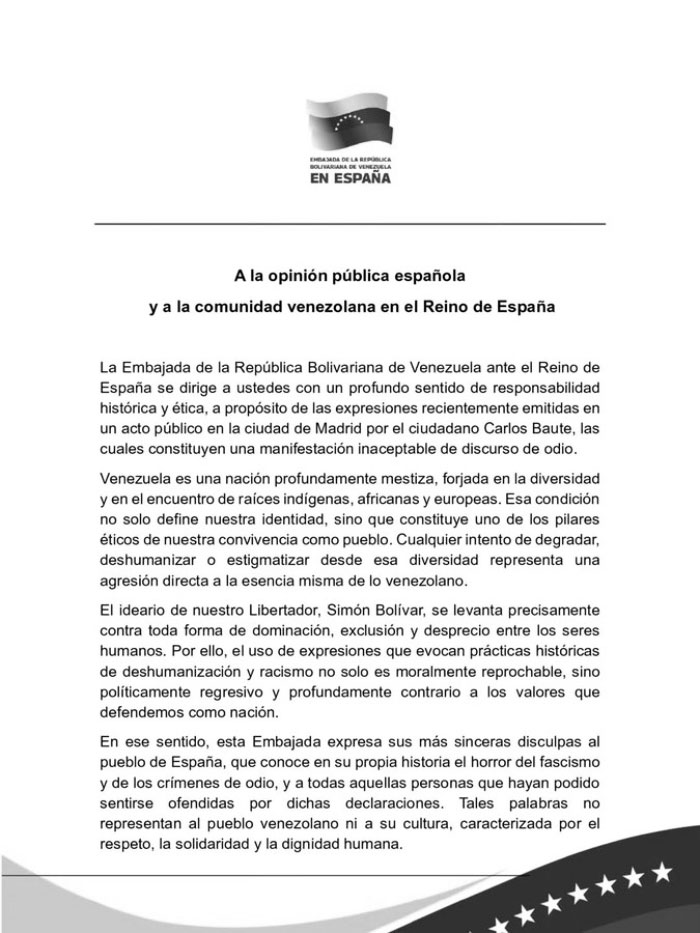 Asimismo, la Embajada extendió «sus más sinceras disculpas al pueblo de España, que conoce en su propia historia el horror del fascismo y de los crímenes de odio, y a todas aquellas personas que hayan podido sentirse ofendidas por dichas declaraciones». Afirmó que «no representan al pueblo venezolano ni a su cultura«, caracterizada por valores como el respeto, la solidaridad y la dignidad humana, criterios que la Presidenta encargada y otras autoridades han llamado a jerarquizar dentro del clima de diálogo y concordia, ajeno a toda suerte de odio, que promueven.
