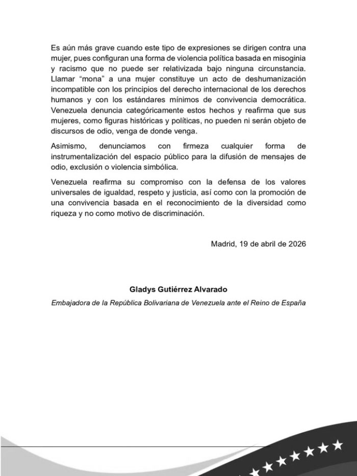 La Embajada recordó que Venezuela es una nación mestiza forjada en la diversidad de raíces indígenas, africanas y europeas. Por tanto, el uso de términos despectivos —específicamente el calificativo de «mona» dirigido hacia una mujer— representa «un acto de deshumanización incompatible con los principios del derecho internacional de los derechos humanos y con los estándares mínimos de convivencia democrática».