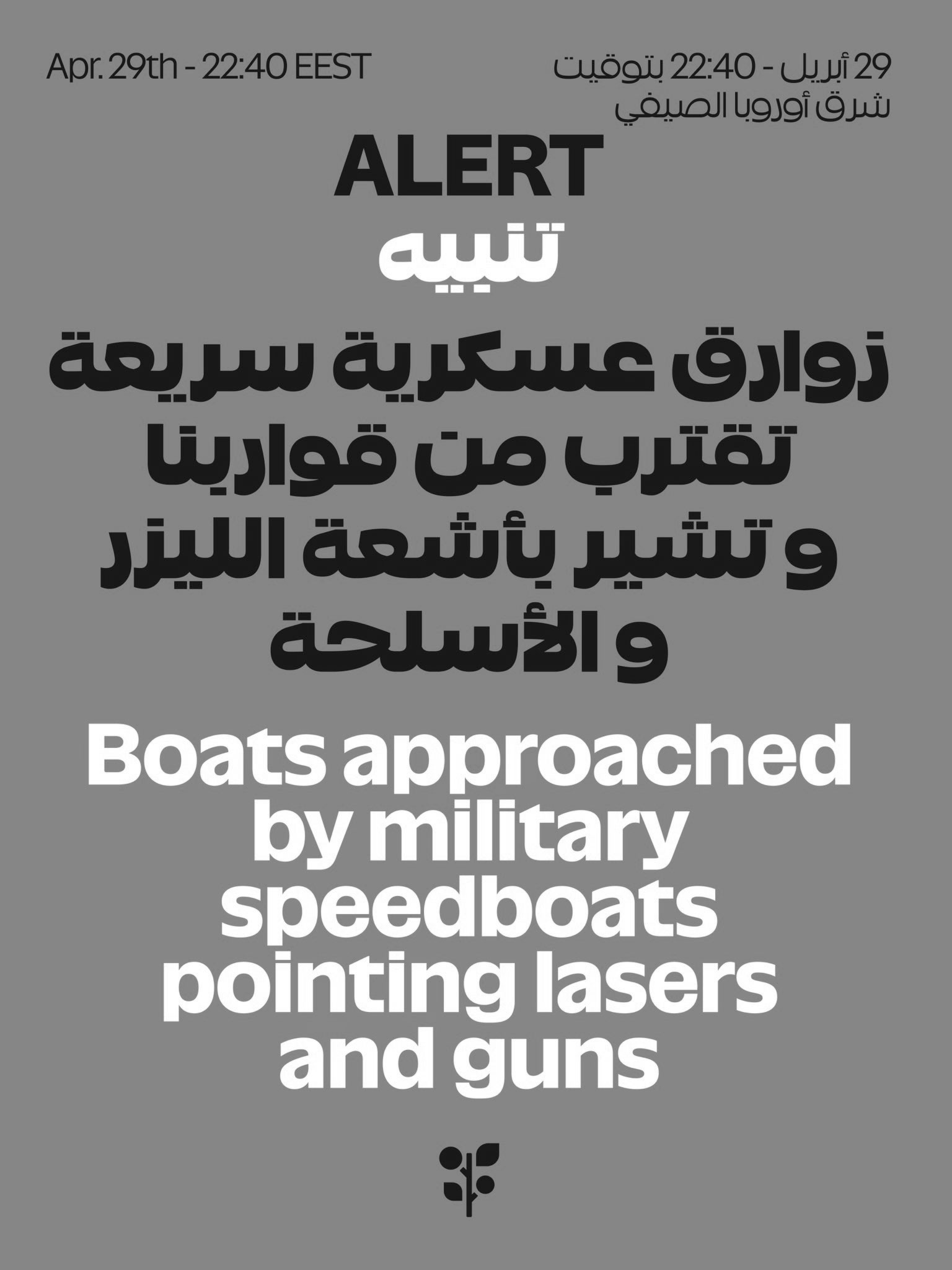 Nota oficial: “Las embarcaciones fueron abordadas por lanchas rápidas militares que se identificaron como israelíes, apuntando con láseres y armas de asalto semiautomáticas, ordenando a los participantes ir a la proa de las embarcaciones y ponerse de rodillas con las manos en alto. Las comunicaciones de las embarcaciones están siendo interferidas y se ha emitido una señal de SOS».