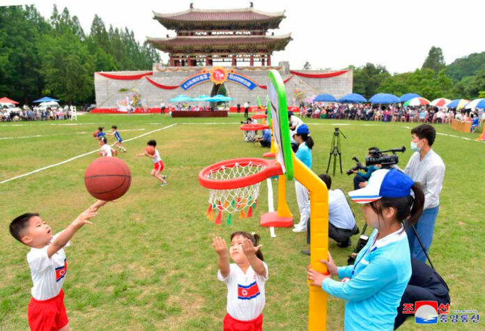 De acuerdo con la agencia estatal de noticias ACNC, la gimnasia y los juegos de la población infantil demostraron la felicidad de los niños coreanos en el Socialismo.