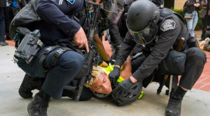 ARCHIVO – La policía tira al suelo a un manifestante pro-palestino para atarle las muñecas en la Universidad de California, Irvine, después de que la policía comenzara a desplazar a los manifestantes y un campamento fuera del patio, el 15 de mayo de 2024, en Irvine, California (Leonard Ortiz/The Orange County Register via AP, Archivo)