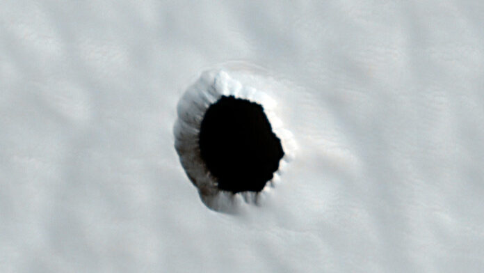 La cámara de alta resolución HiRISE a bordo de la sonda Mars Reconnaissance Orbiter (MRO) – diseñada por la NASA para estudiar la atmósfera y la superficie de Marte – captó, el 15 de agosto de 2022, un «pequeño agujero» en el suelo marciano.