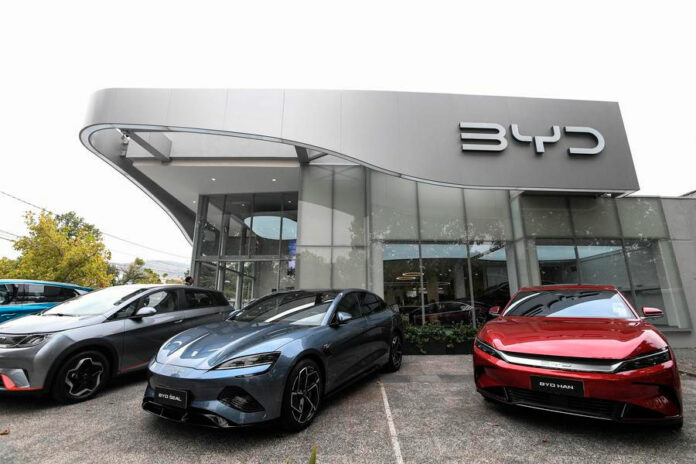 Imagen del 20 de marzo de 2024 de vehículos eléctricos chinos de la marca BYD exhibidos para su venta, en Santiago, capital de Chile. (Xinhua/Jorge Villegas)