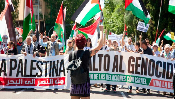 Entre banderas palestinas y eslóganes de rechazo a los crímenes de guerra israelíes en Gaza, alrededor de 4.000 personas marcharon este sábado por calles de la capital española Madrid, en apoyo al pueblo gazatí, en rechazo al asesinato de cerca de 35.000 palestinos por las fuerzas de ocupación y para exigir al Gobierno de Pedro Sánchez cortar relaciones diplomáticas y económicas con la entidad sionista.