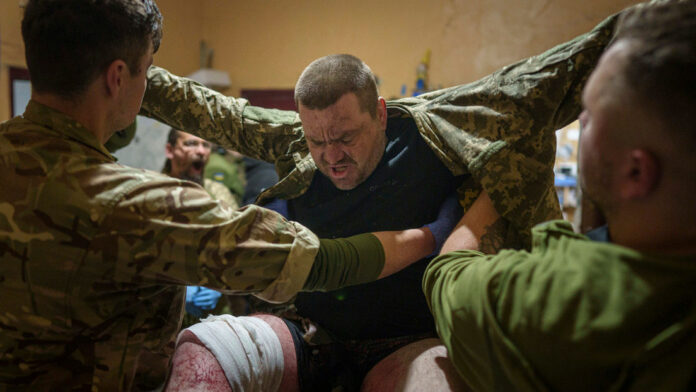 Médicos militares ucranianos atienden a un soldado en un hospital del Donbass, el 10 de mayo de 2024. | Evgeniy Maloletka / AP