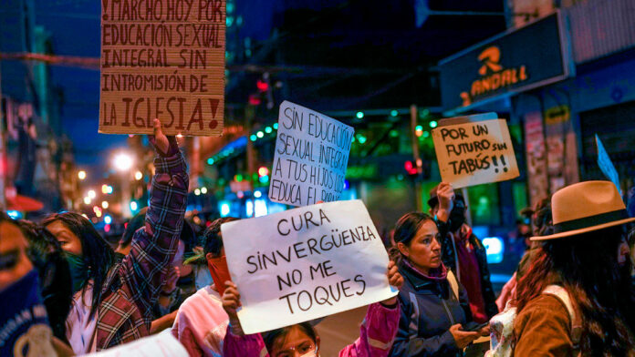Protesta contra los abusos sexuales de la Iglesia católica. Bolivia, 15 de mayo de 2023. | Juan Karita / AP