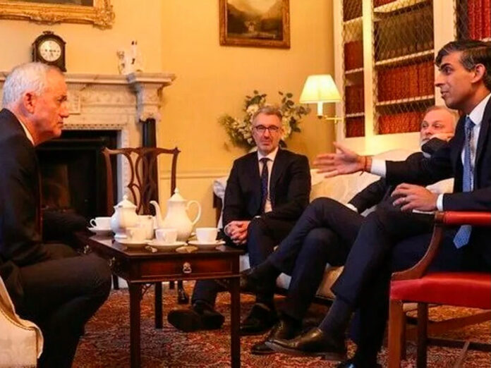 Benny Gantz (a la izquierda en la foto) viajó a Londres para reunirse con el consejero de seguridad nacional británico, Tim Barrow. Para sorpresa de Gantz, el primer ministro, Rishi Sunak (en el extremo derecho de la foto), también quiso conversar con él para decirle que Israel no debe convertirse en un Estado como los demás. El proyecto colonial británico sigue obstaculizando la paz.