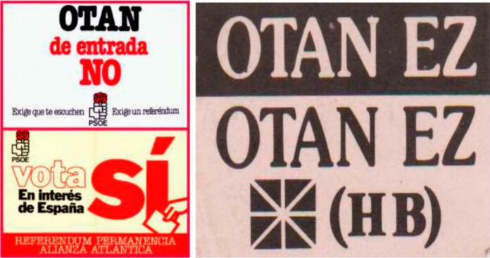 Hoy, cuando se cumplen 38 años del referéndum, se observa que desde la Izquierda Abertzale (Sortu integrada en EH Bildu) continúan señalando aquel resultado. Un recordatorio que llama mucho la atención. ¿Por qué? Pues porque resulta que hoy en día EH Bildu es fiel apoyo del PSOE, el partido que, de hacer campaña “OTAN, de entrada NO”, pasó a consolidar la permanencia del Estado español en la banda terrorista.