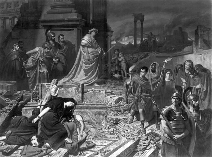 Henryk Sienkiewicz una vez más. Es julio del año 64 d. C. Al atardecer, deja a Pedro de pie ante el telón de fondo de Roma con la cristiana Ligia, en toda su desesperación ante esta ciudad: “¿Cómo derrotaré su maldad?”.