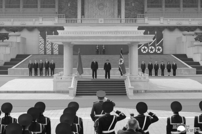 Guiado por el camarada Kim Jong Un, Aleksandr Lukashenko pasó revista a la guardia de honor del EPC.