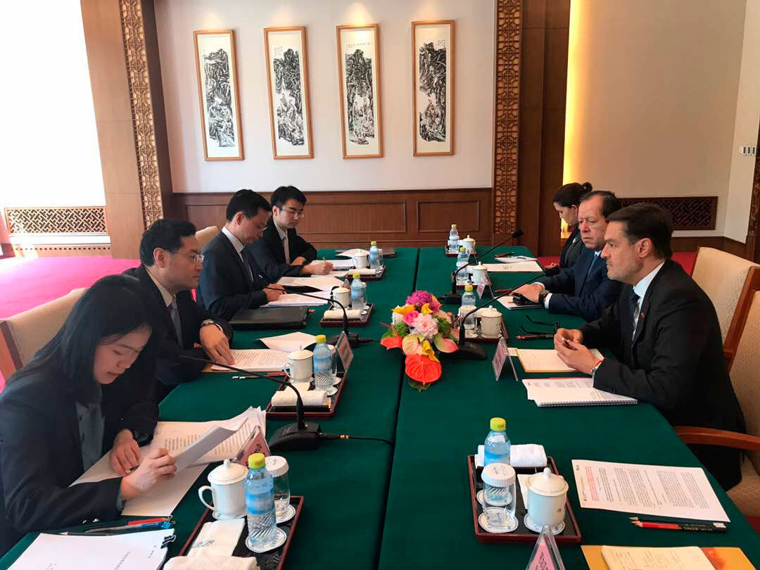 Plasencia sostuvo reuniones de trabajo con la ministra asistente del Departamento Internacional del Comité Central del PCCh, Shen Bei Li y con el ministro asistente de la Cancillería de China, Qin Gang, en las cuales se revisaron las relaciones bilaterales y se abordaron temas de interés mutuo para ambos países.