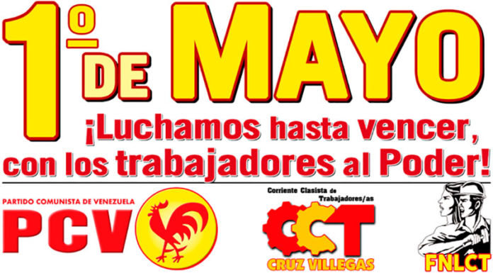 El Partido Comunista de Venezuela (PCV), la Corriente Clasista de Trabajadores y Trabajadoras «Cruz Villegas» (CCT-CV) y el Frente Nacional de Lucha de la Clase Trabajadora (FNLCT) hacemos llegar a las y los trabajadores de Venezuela y del mundo un fraternal saludo clasista, en este DÍA INTERNACIONAL DE LA CLASE TRABAJADORA que coincide con el centenario de la Gran Revolución Socialista de Octubre (Rusia 1917), primera revolución proletaria triunfante que hizo posible la edificación de un Estado Socialista, hecho sin precedentes en la historia, que inspira y fortalece a los que luchamos por el poder para la clase obrera y la abolición de la propiedad privada sobre los medios de producción, en pro de liberar a la humanidad de la explotación capitalista.