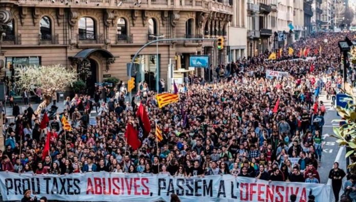 La manifestación, bajo el lema ‘Prou taxes abusives. Passem a l’ofensiva’ (Basta de tasas abusivas, pasemos a la ofensiva), se ha iniciado en la plaza de Universitat y ha discurrido por las calles del centro de la ciudad, en el marco de la jornada de huelga convocada por el Sindicat d’Estudiants dels Països Catalans (SEPC).